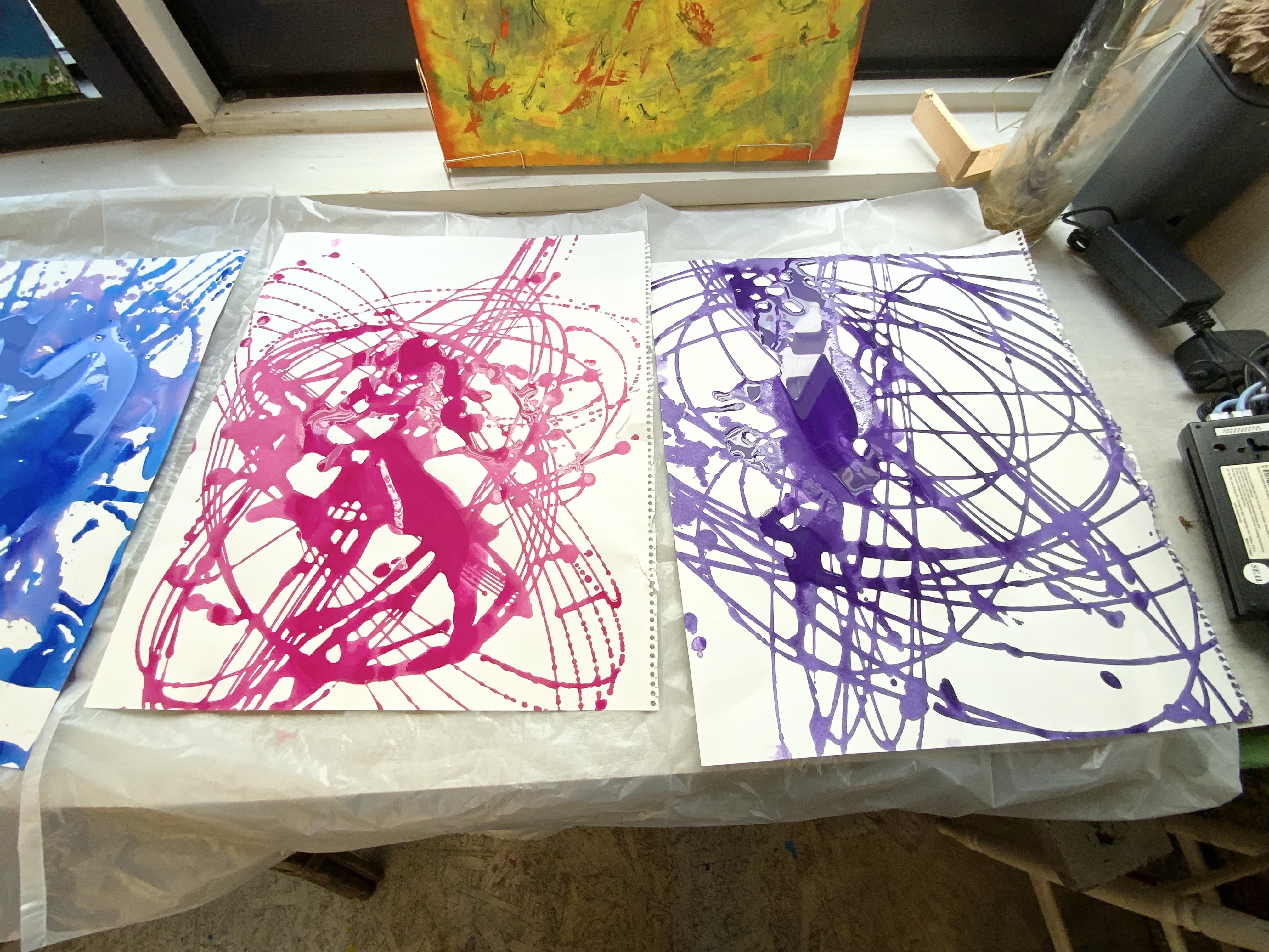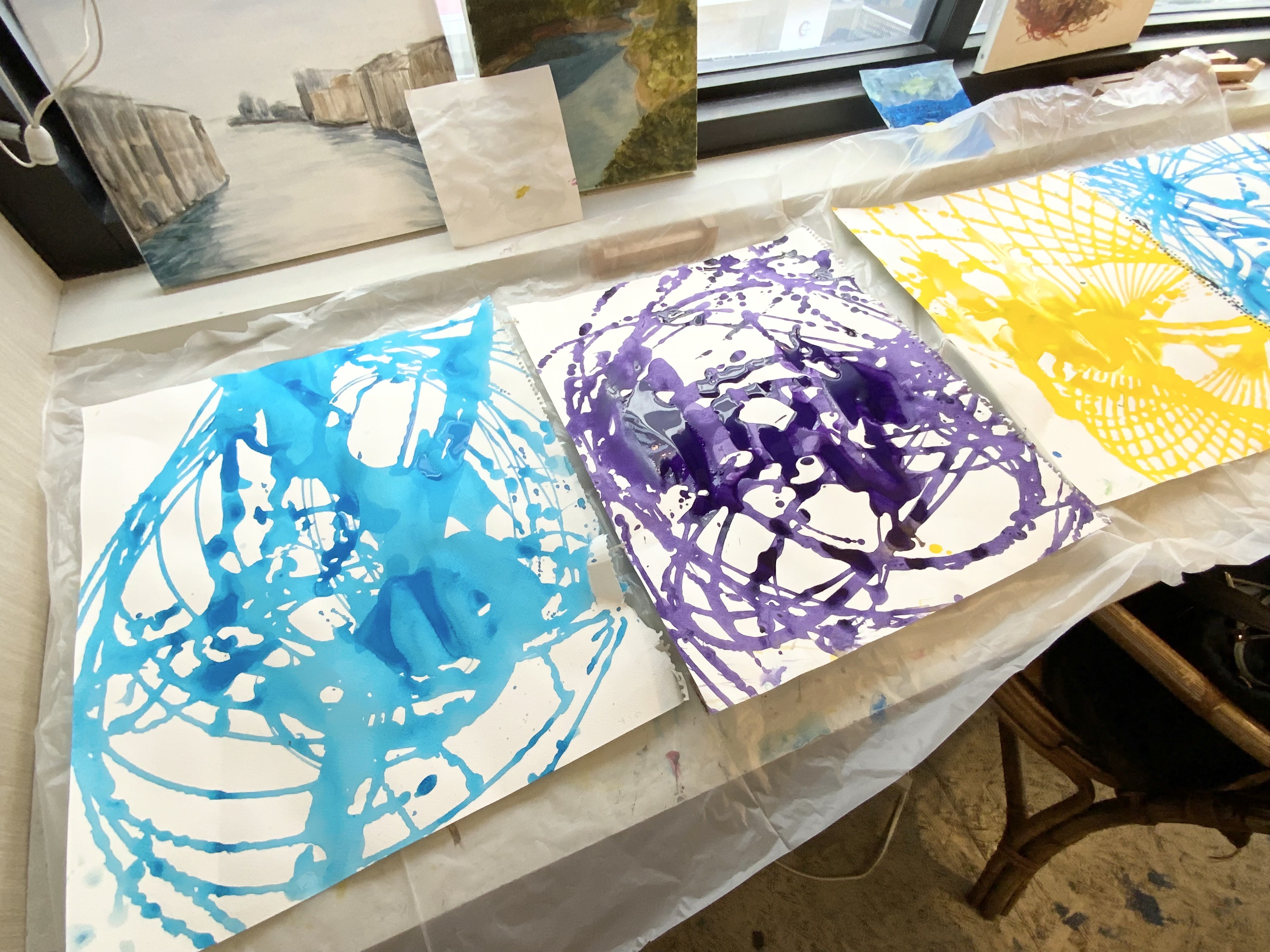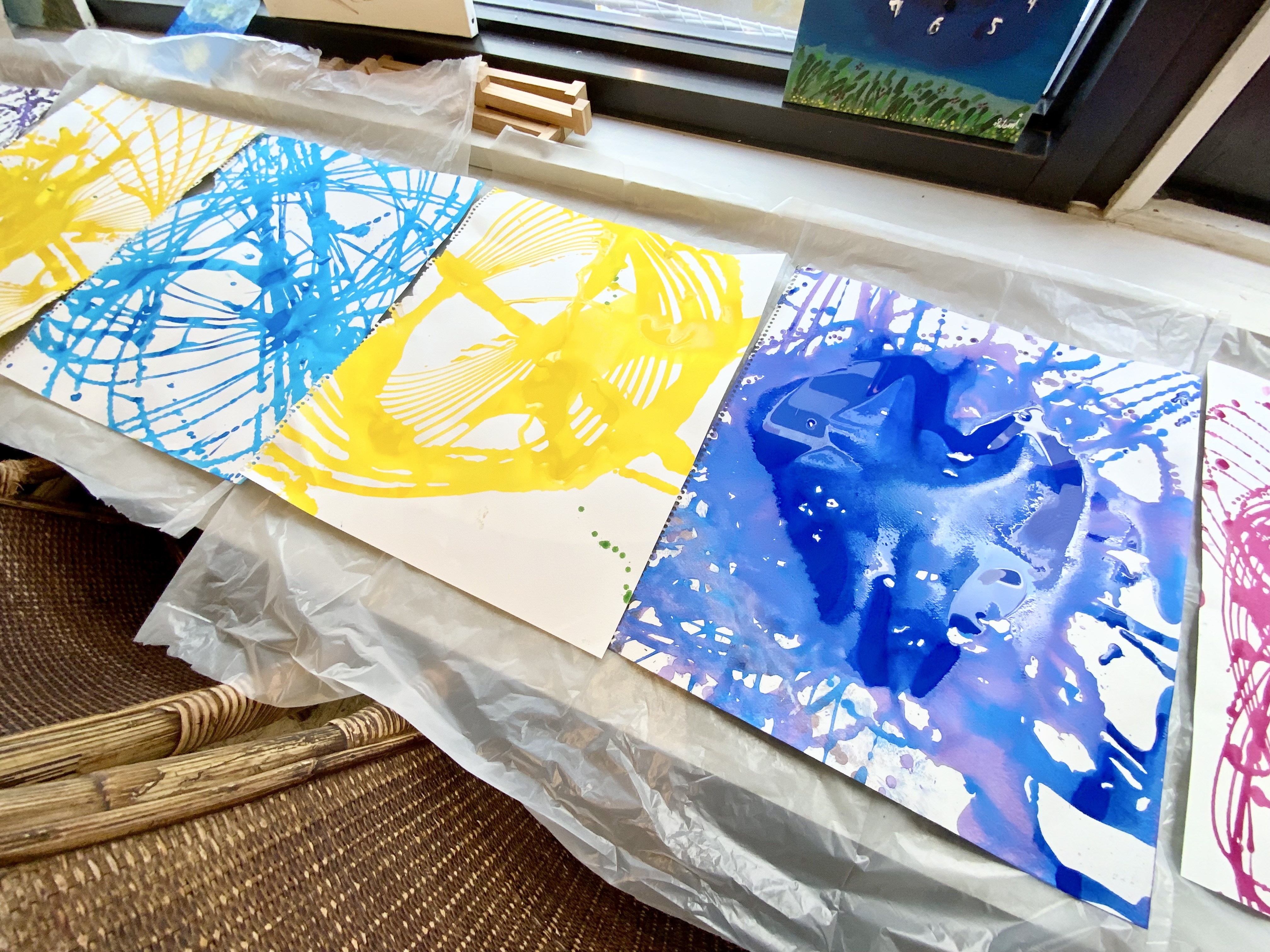 今回はプラスチックのコップの底に穴をあけて、絵の具を垂らしていきました。一度手を離すとあっという間に抽象的な画面が出来上がりますきらきら